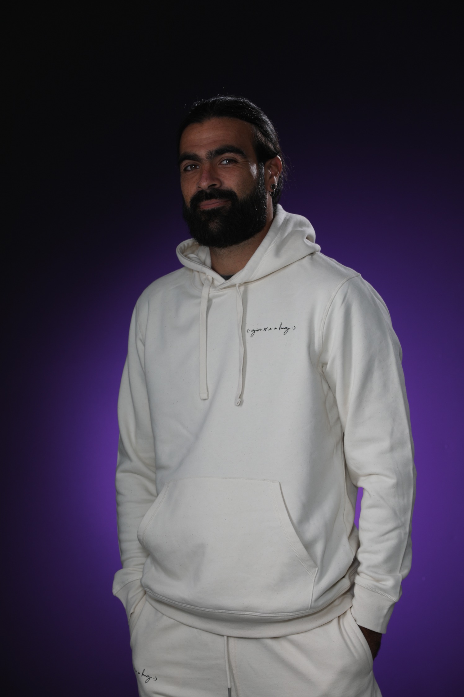 Avant : logo « GIVE ME A HUG » en noir, discret côté cœur