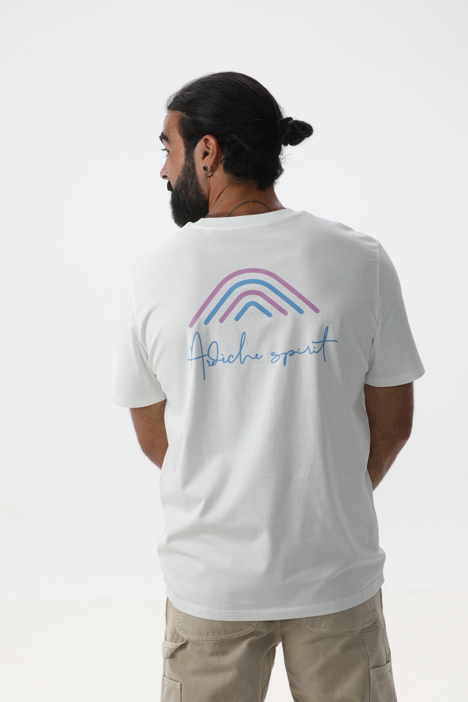 Dos : grand logo « ARDÈCHE SPIRIT » en bleu et rose