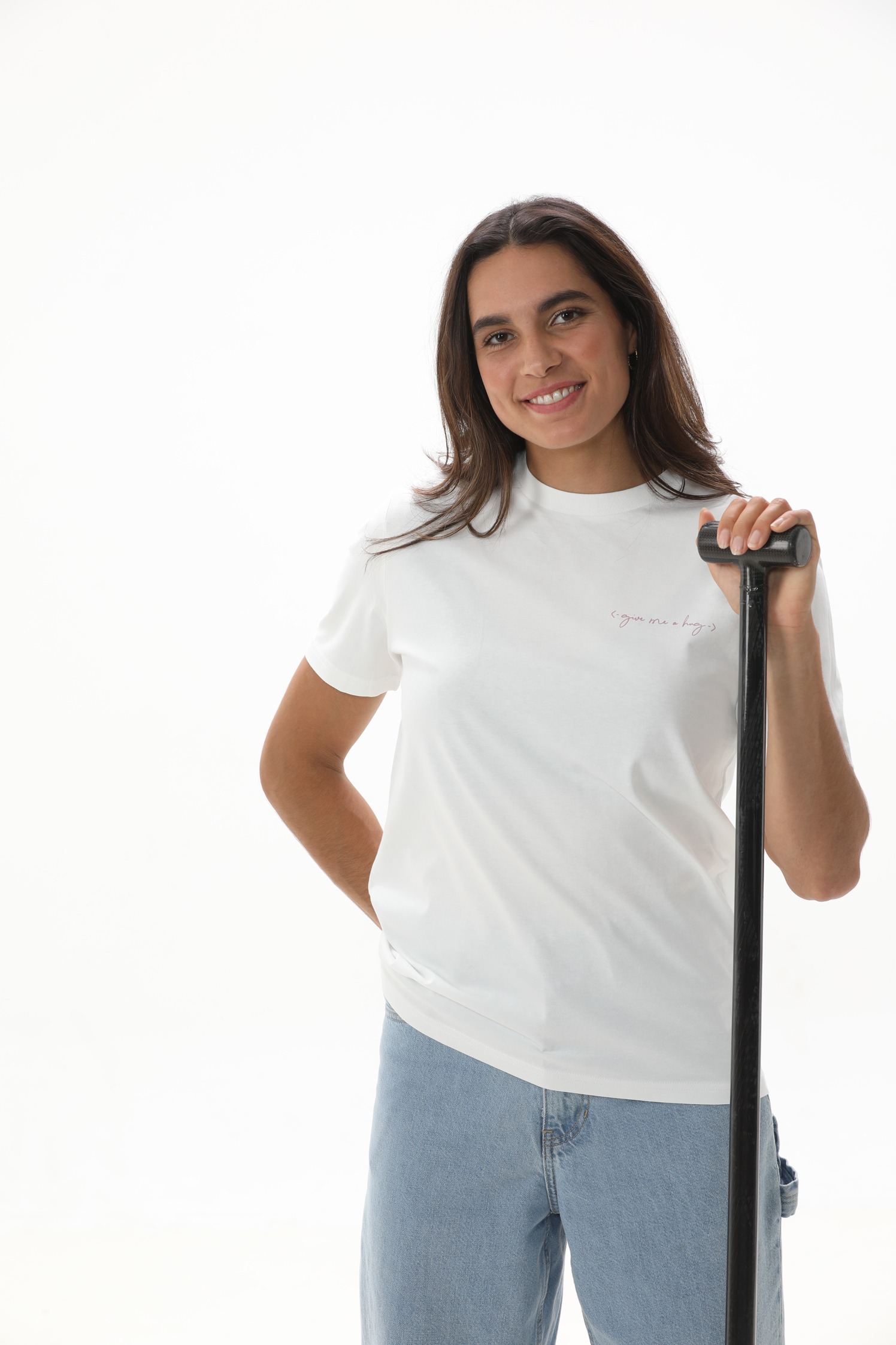 Avant : logo « GIVE ME A HUG » en rose, discret côté cœur