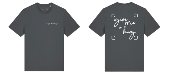 Le t-shirt « GIVE ME A HUG » en version anthracite avec logo blanc offre un contraste sobre mais puissant.